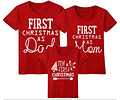 Estas camisetas resaltan por sus detalles especiales y personalizados. Cada camiseta lleva el lema "First Christmas" junto con diseños navideños distintos, creando un conjunto memorable para celebrar la ocasión única de la primera Navidad en familia.